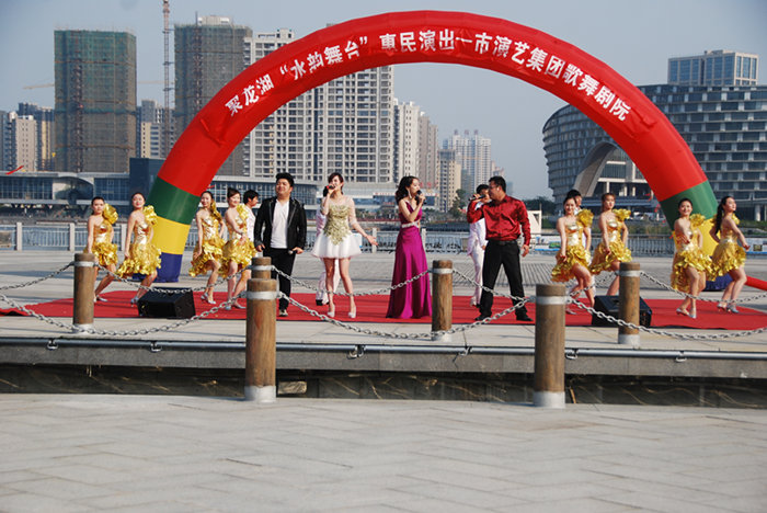 4月25日下午4點,“水韻舞臺”惠民演出在市區(qū)聚龍湖公園開演。鹽城市演藝集團(tuán)在聚龍湖公園設(shè)立“水韻舞臺”文化惠民點,利用周六、周日及法定節(jié)假日時間,為市民送上文藝節(jié)目。 演出在歡快的舞蹈《開門大吉》中拉開帷幕,活力四射的舞蹈《小蘋果》、悠揚(yáng)的薩克斯獨奏《回家》、深情的男女聲演唱……整場演出好戲連臺,吸引市民駐足觀賞,現(xiàn)場不時爆發(fā)出熱烈的掌聲。 今年以來,為落實市委、市政府文化惠民的相關(guān)要求,積極策應(yīng)打造聚龍湖文化集聚區(qū)的戰(zhàn)略,啟動聚龍湖“水韻舞臺”惠民演出活動。每周六、日下午4:30,水韻舞臺將定期上演文藝節(jié)目。水韻舞臺將形成固定時間、固定地點、固定主題,最終將其打造成演藝乃至省內(nèi)外知名的文化品牌。在演出團(tuán)體和節(jié)目安排上,充分考慮到不同年齡結(jié)構(gòu)和欣賞層次觀眾的需求。歌舞類節(jié)目由市歌舞劇院精選出的弘揚(yáng)社會正能量、反映時代主旋律的現(xiàn)代歌舞;中老年觀眾則有機(jī)會聆聽到省淮劇團(tuán)藝術(shù)家們奉獻(xiàn)的傳統(tǒng)劇目折子戲經(jīng)典唱段。
